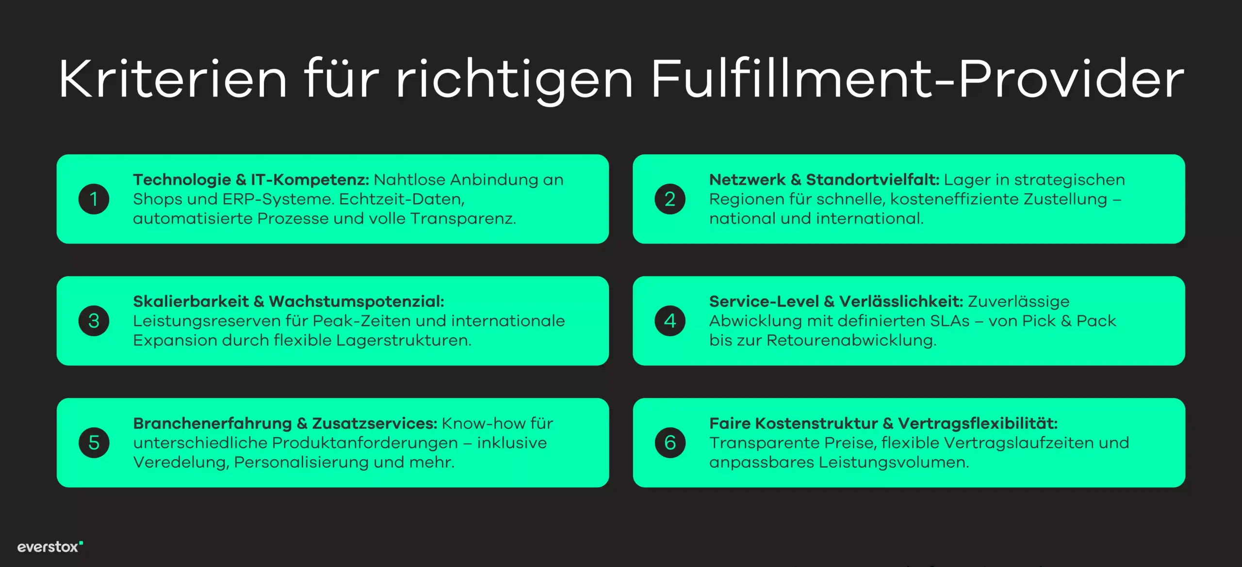 Angesichts der strategischen Bedeutung lohnt es sich, den passenden Fulfillment-Partner sorgfältig auszuwählen. Die Anforderungen großer Online-Shops sind hoch – folgende Kriterien solltest du in deine Auswahl einbeziehen: