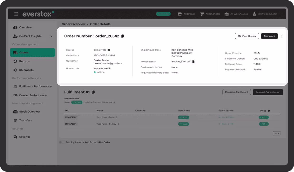Our fulfillment information feature provides detailed insights. Drill down into each order to view line-by-line fulfillment status, item location, and stock availability.