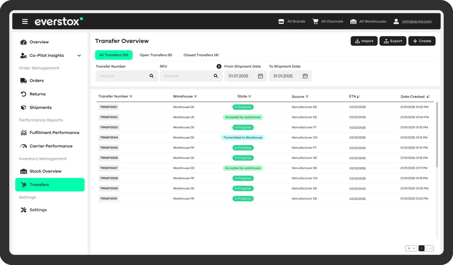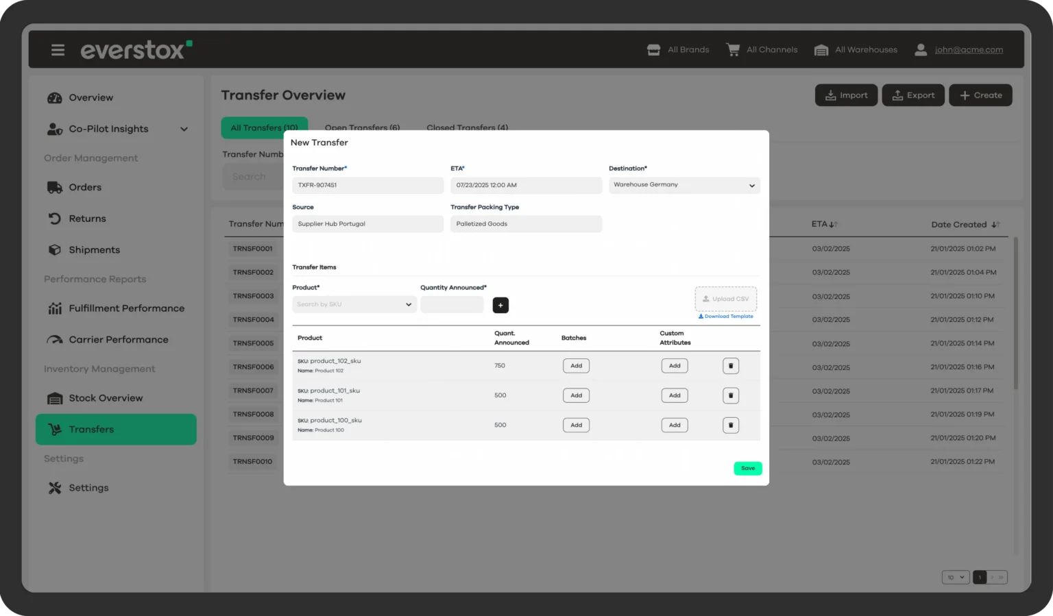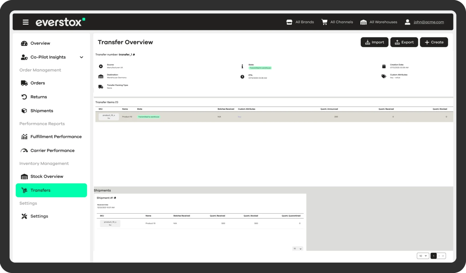 everstox provides a centralized view of all inbounds and transfers across locations. Expected quantities, received units, and booked stock are tracked at SKU level and updated in real time. This allows teams to quickly identify delays, partial deliveries, or discrepancies and act before issues affect fulfillment or sales.