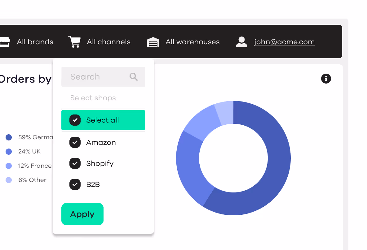 The central dashboard gives you access to reports on inventory, sales per channel, returns, shipping times, and logistics costs. With shipments and returns reporting, you gain detailed insights into carrier performance, delivery lead times, and return reasons – enabling you to continuously optimize your strategy.